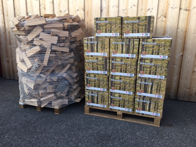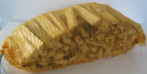 handgeschichtete dünne Holzscheite im Raschelsack. Auch hier zählt die Qualität des Holzes.